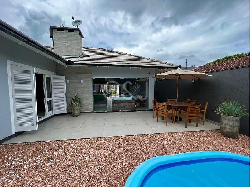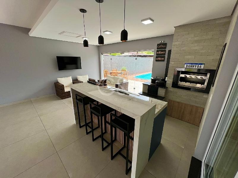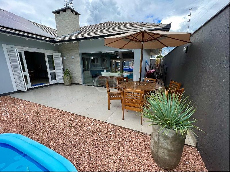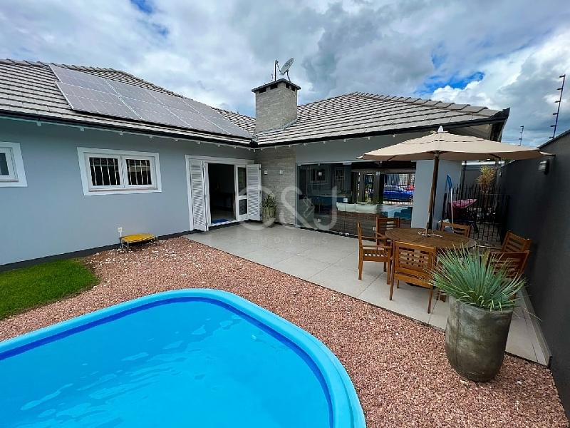 Casa plana com 226m² construídos, 2 terrenos de 657m² em esquina. Possui garagem para 2 carros com área gourmet, piscina, 3 quartos sendo 1 suíte com closet e banheira, 2 banheiros, lavanderia, sala e cozinha integradas com ótimo espaço, casa toda de chapa e acabamentos em gesso, sistema de água com aquecimento a gás, energia solar, semi mobiliada, 3 ar condicionados, exelente espaço no pátio. Imóvel diferenciado, alto padrão de qualidade.